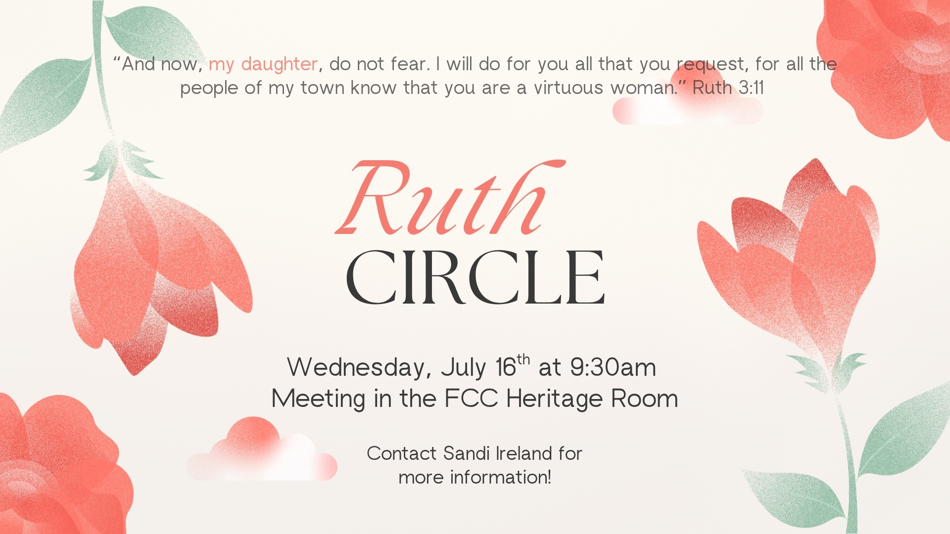 Ruth Circle + Add to Google Calendar + iCal / Outlook export Date Jul 16 2025 Expired! Time 9:30 am - 10:30 am Category Ruth Circle Share this event